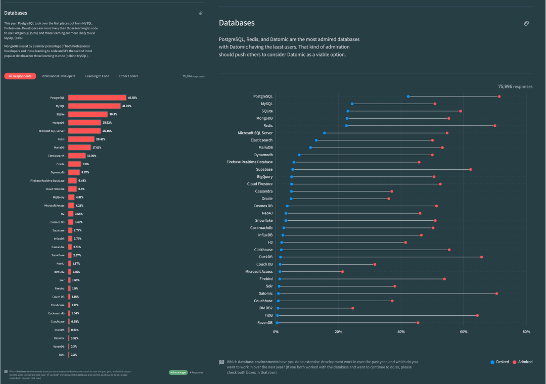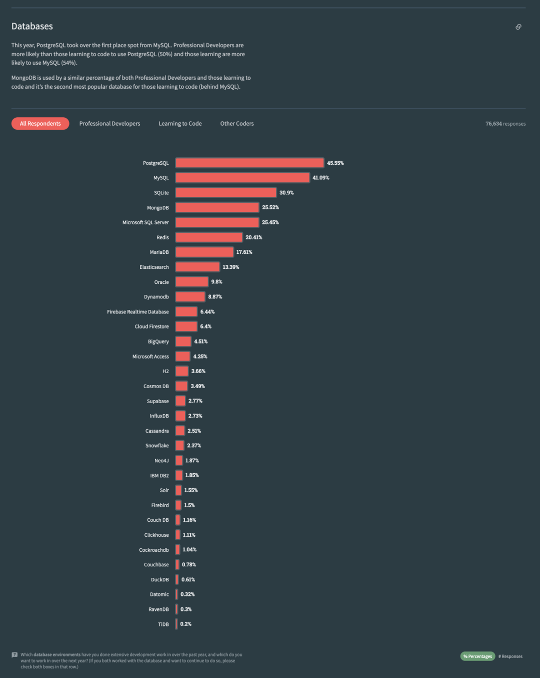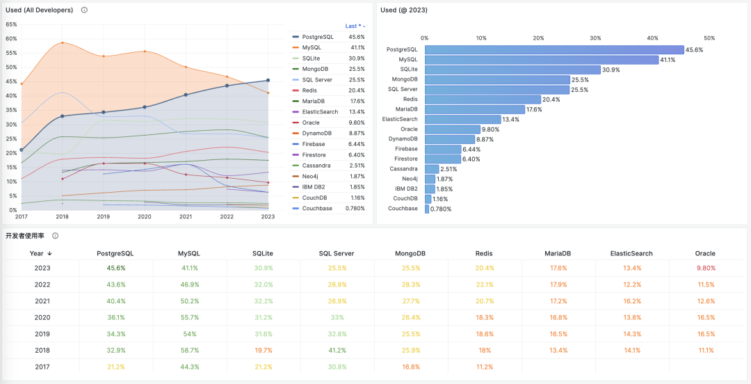 在 2023 年, “最先进” PostgreSQL 在所有开发者中以 45.6% 的使用率,首次超过“最流行”数据库 MySQL 41.1%,领先 4.5% ,使用率是第二名 MySQL 的1.1倍。对于专业开发者(约占总样本的3/4)来说,PostgreSQL 的使用率在去年(2022)就已经超过 MySQL 了,以 46.5% vs 45.7% 领先0.8个百分点,在 2023 年,这一差距进一步拉大到 49.1% vs 40.6,领先 8.5% —— 换句话说,专业开发者中,PostgreSQL 的使用率已经是 MySQL 的 1.2 倍了。
