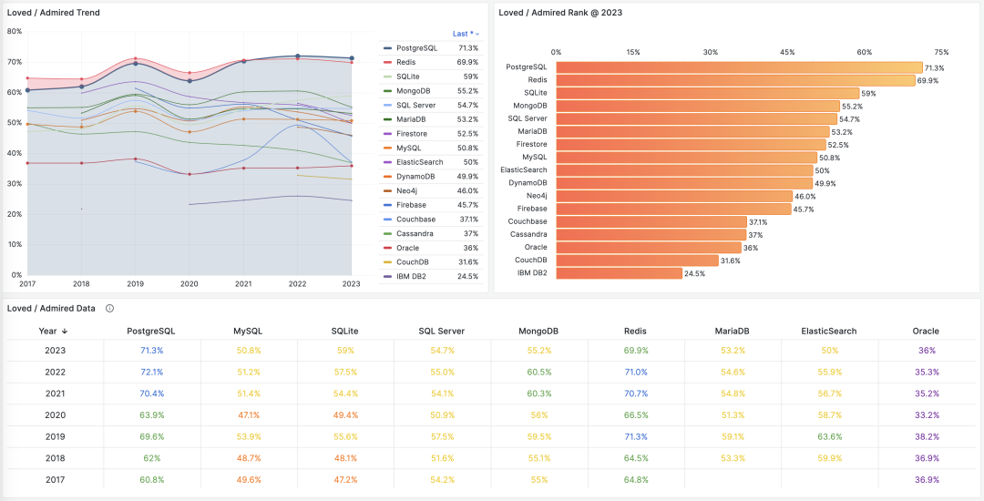 2023 年, PostgreSQL 蝉联最受开发者喜爱的数据库。过去几年 Redis 一直是用户最喜欢的数据库。直到 2022 年,PostgreSQL 第一次超过 Redis,成为最受开发者喜爱的数据库。PostgreSQL 和 Redis 的口碑一直在伯仲之间(70%),并与其他后来者拉开了非常显著的差距。