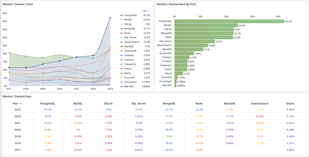 在需求度 / 渴望度 这一项中,PostgreSQL 一骑绝尘,远远甩开其他数据库。以 42.3% 的比例连续第二年获得第一,且保持着一往无前的增长态势。不断与后来者拉开距离。