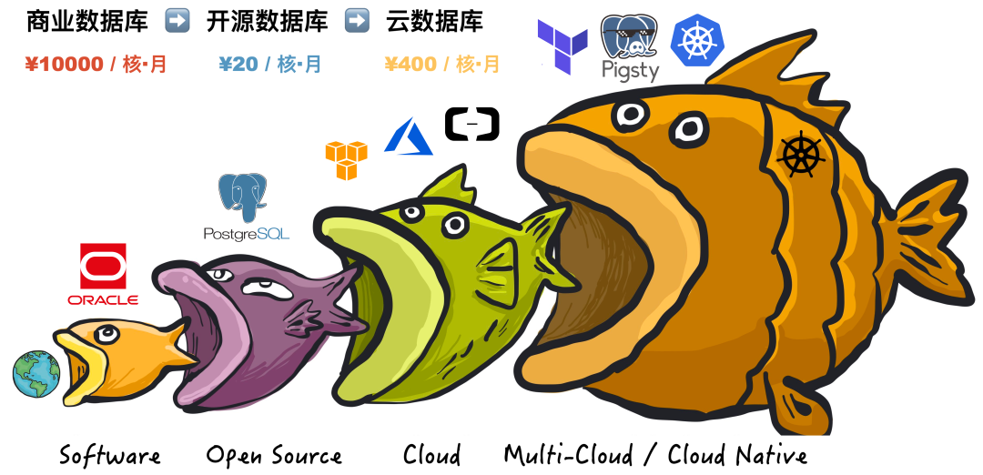 很久很久以前,开发软件/信息服务需要使用非常昂贵的商业数据库软件。单花在软件授权上的费用可能就有六七位数,加之相近的硬件成本与服务订阅成本。Oracle一个 CPU 核一年的软件授权费用便高达十几万,壕如阿里也吃不消要“去IOE”。以 PostgreSQL / MySQL 为代表的的开源数据库崛起,让世界多了一个新的选择。