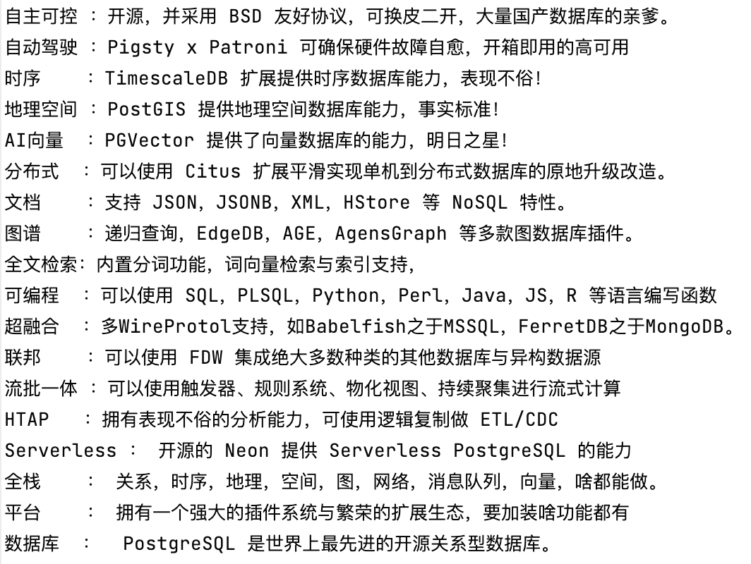 PG的“才”在于先进。一专多长,全栈多模:“自主可控自动驾驶时序地理空间AI向量分布式文档图谱全文检索可编程超融合联邦流批一体 HTAP Serverless 全栈式平台数据库”,单一组件即可覆盖几乎所有数据库需求。