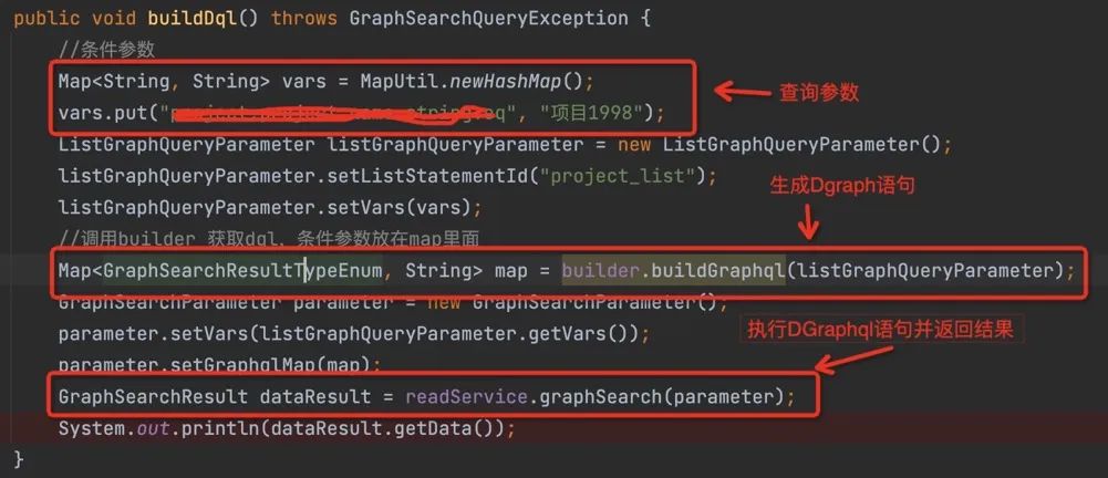 设计客户端的设计参照 Mybatis 查询的半自动模版配置模式,即在模版中写半自动的 Dgraph 语句,在代码中将参数、条件等写入,目前已经完成通用模版的配置,调用方无需自己写 Dgraph 语句,只需调用接口,构造查询条件,SDK 即可生成 Graphql 语句并执行查询,返回查询结果。