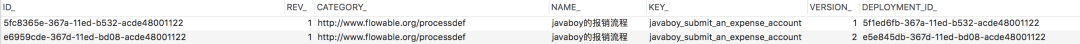 这个表是流程部署表,每部署一个流程,这张表中就会新增一条记录,用来描述我们刚刚定义好的流程: