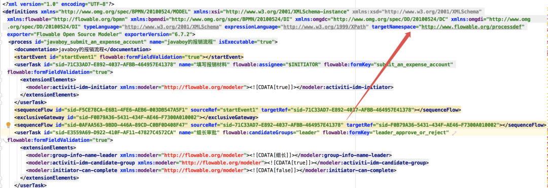 另外,该表中有一个 CATEGORY_ 的字段,这个字段表示流程的分类,注意这个和部署的分类可不一样,流程部署的分类参数第二小节的代码,流程的分类,说白了其实就是我们流程定义 XML 文件中的 targetNamespace 属性,如下图:
