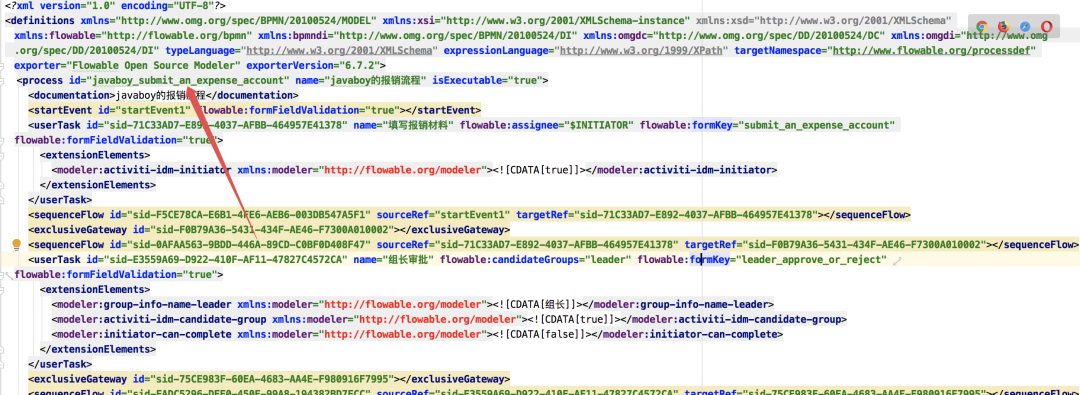那么系统是怎么识别修改后的流程和前一个流程是同一个呢?主要是靠流程的 id 属性,如下图:
