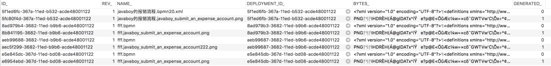所以一个流程部署,在这张表中对应两条记录,一条记录 XML 文件,一条记录流程图片。