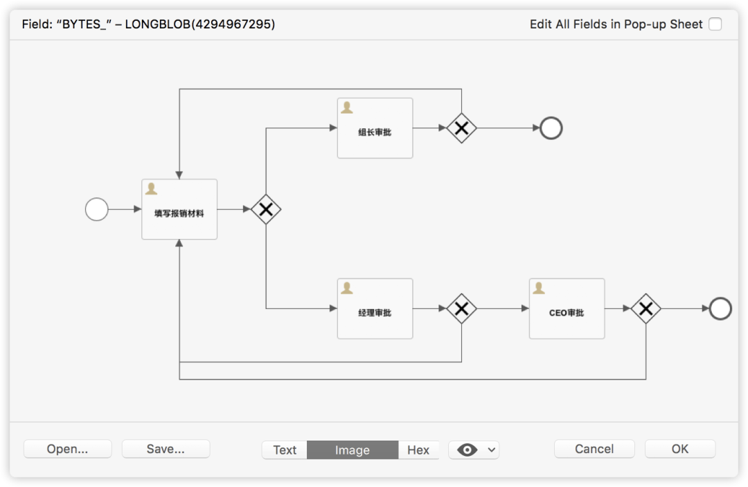 这个表中有一个 BYTES_ 字段,我们部署的流程的 XML 文件就保存在这里,同时,系统默认还会根据 XML 文件生成一张流程图片,也保存在这里,图片就像下面这种: