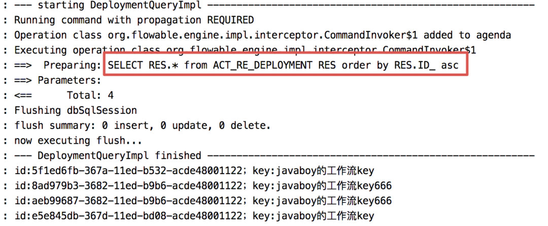 void test01() throws IOException { Deployment deployment = repositoryService.createDeploymentQuery().deploymentKey("javaboy的工作流key").latest().singleResult(); logger.info("id:{};key:{}", deployment.getId(), deployment.getKey());}1.2.3.4.5.我们来看下控制台打印出来的 SQL: