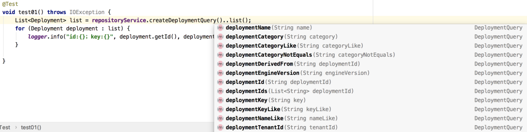 void test01() throws IOException { List<Deployment> list = repositoryService.createDeploymentQuery().list(); for (Deployment deployment : list) { logger.info("id:{};key:{}", deployment.getId(), deployment.getKey());}}1.2.3.4.5.6.7.创建一个查询器,然后返回所有的流程部署信息并打印出来,我们看下此时 IDEA 控制台打印出来的 SQL 信息:
