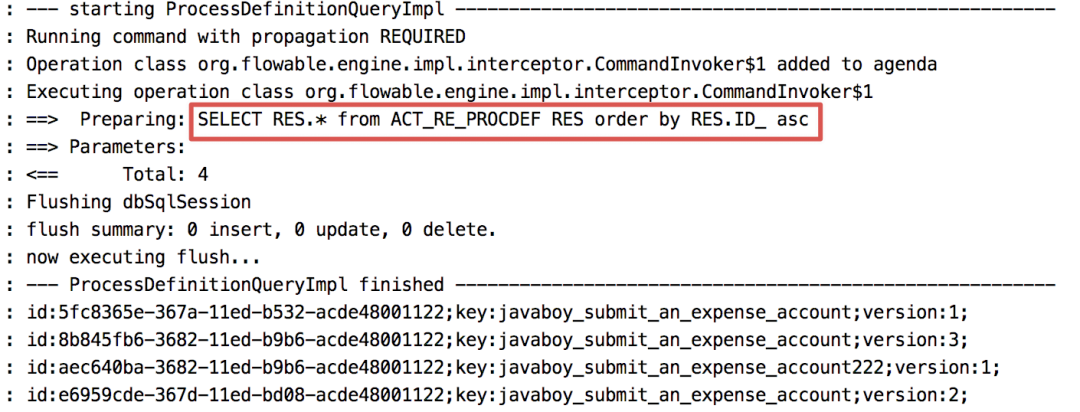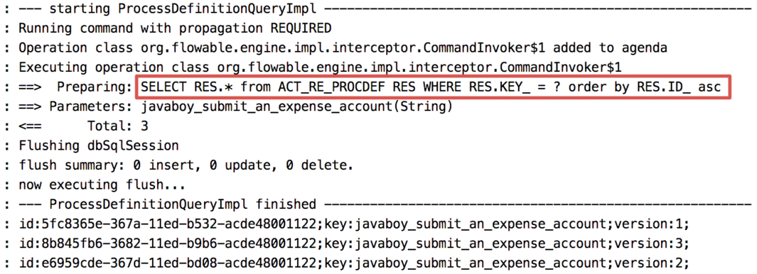 void test02() { List<ProcessDefinition> list = repositoryService.createProcessDefinitionQuery().processDefinitionKey("javaboy_submit_an_expense_account").list(); for (ProcessDefinition pd : list) { logger.info("id:{};key:{};version:{};",pd.getId(),pd.getKey(),pd.getVersion());}}1.2.3.4.5.6.7.我们来看下查询 SQL: