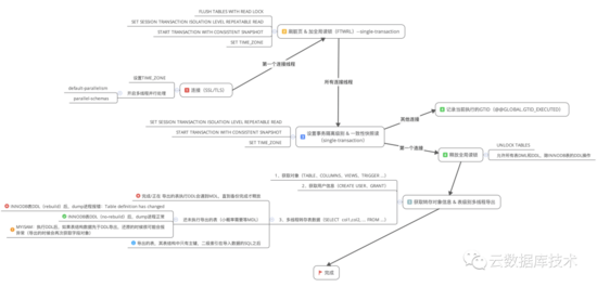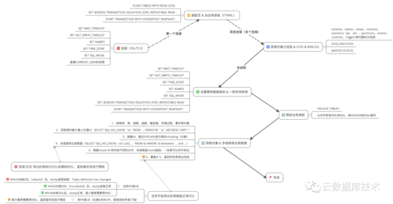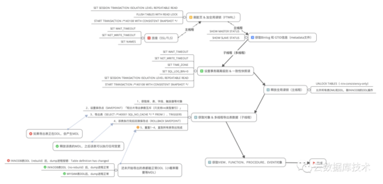1. 连接数据库,设置当前变量,刷脏页并加一个全局读锁,此刻数据库实例只能SELECT,不能执行任何类型的操作(会影响业务),再获取BINLOG和GITD 信息并设置事务隔离级别和开启一致性快照,此时所有的支持事务的表(INNODB)数据均来自同一时间点。最后再释放全局读锁,此刻数据库实例可以执行任何操作(正常情况,加全局读锁和释放锁的时间很短)。