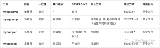 各逻辑备份工具的参数可以看官方文档,对 比各工具之后,如表所示: