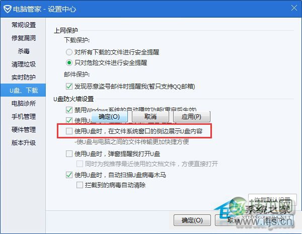 2、内容打开设置后,企商汇显示我们取消勾选“使用U盘时,闭方在文件系统窗口的算机侧边展示U盘内容”选项,然后应用。