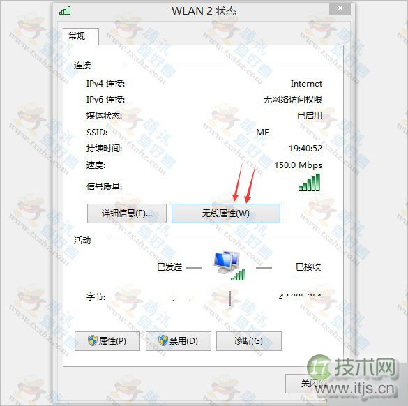 3、会弹出WLAN2状态,再点击这个“无线属性”