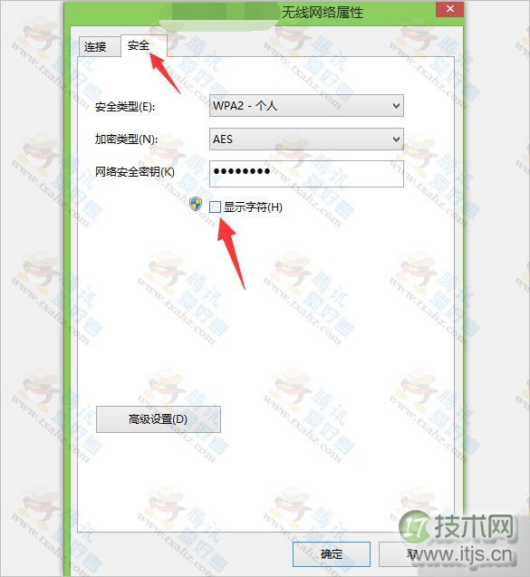 4、再点“安全”与“显示字符”即可查询到Windows 8连接的WIFI密码