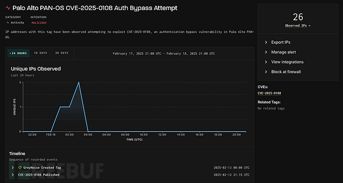 立即应用补丁:尽快将 PAN-OS 升级到 10.1.14-h9、10.2.13-h3、11.1.6-h1 或 11.2.4-h4 版本,这些版本已修复 CVE-2025-0108 漏洞。限制管理界面访问:只允许受信任的内部 IP 地址进行连接,坚决避免管理界面暴露在公共互联网中。禁用未使用的服务:若不需要 OpenConfig 插件,应及时将其停用,以防它成为额外的攻击入口。监测攻击行为:借助 GreyNoise 等威胁情报平台,实时跟踪与 CVE-2025-0108 相关的恶意 IP 地址。Assetnote 的舒巴姆・沙阿(Shubham Shah)指出,CVE-2025-0108 的真正威胁在于,它为攻击者提供了初始访问途径。他强调:“攻击者会将这个漏洞与二次漏洞利用程序结合,从而实现命令执行。” 这种攻击策略并非首次出现,与之前利用 CVE-2024-0012 和 CVE-2024-9474 针对 PAN-OS 身份验证机制的攻击活动如出一辙。
