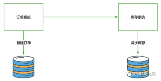 假设存在订单系统与库存系统,在实际业务中订单的创建会伴随着库存的减少。两个系统为微服务化部署,其应用数据也存放在独立的数据库中,两个系统间通过网络进行通信。