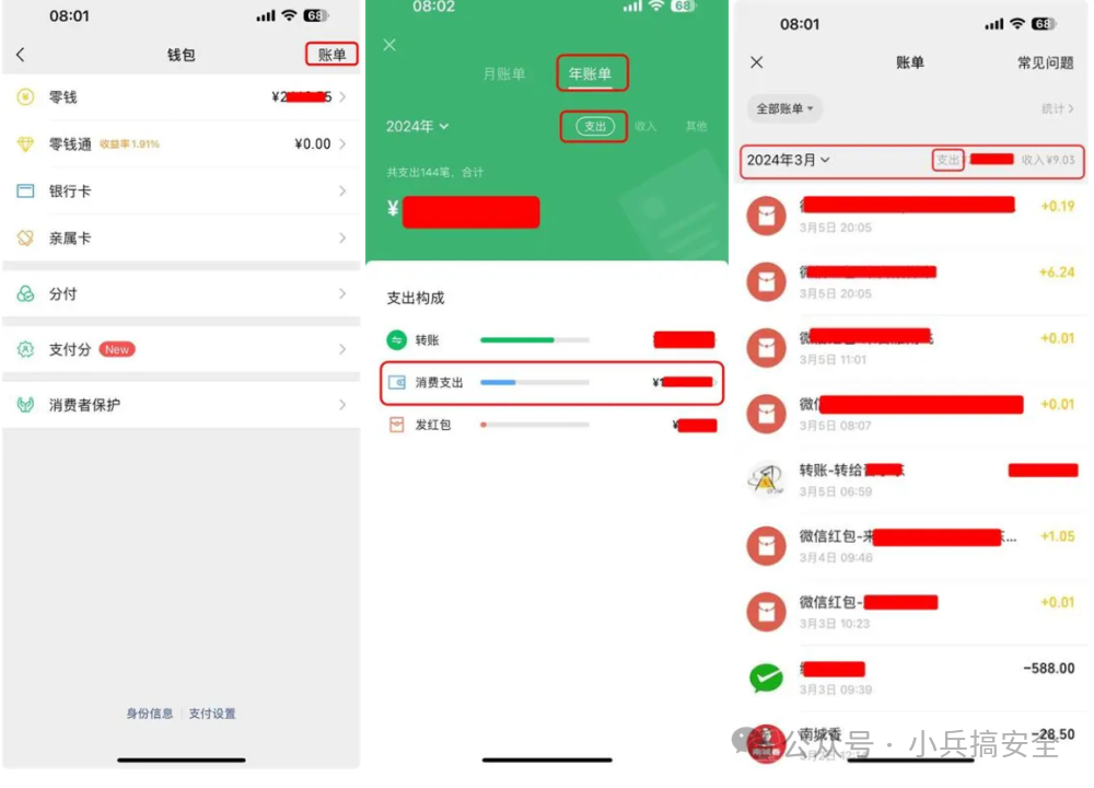 2.核对支出情况如图2所示,单击“账单”-“年账单”-然后选择“支出”-单击“消费支出”或者“转账”查看曾经的安全一些支出。可以根据实际情况来查看。手短信
