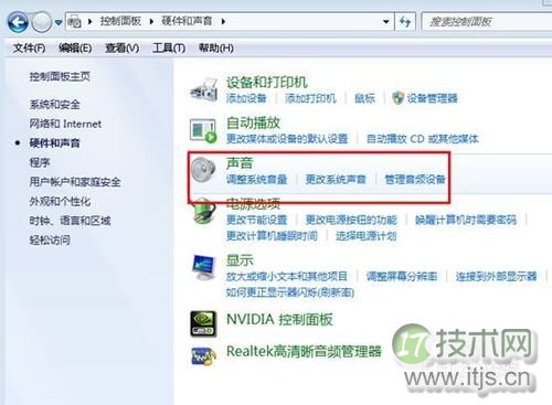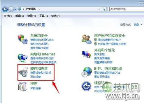 找到开始菜单- 控制面板功能(安装类别排序,杂音如下图所示)选择 硬件和声音