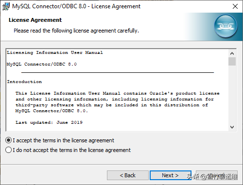 按下一步按钮后,将出现许可协议对话框。如果您同意许可协议,请按我接受许可协议中的条款单选按钮,然后单击下一步按钮: