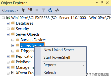 转到 SSMS,在对象资源管理器中,在Server Objects文件夹下,右键单击Linked Servers文件夹,然后从菜单中选择New Linked Server选项: