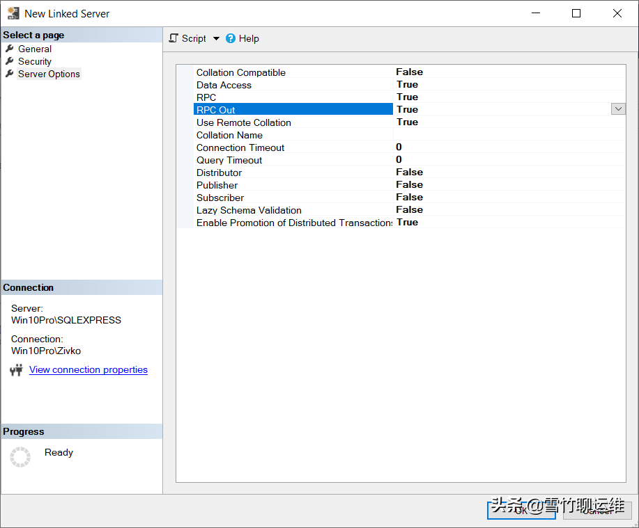 在Server Options 选项卡下,将RPC和RPC Out字段设置为True: