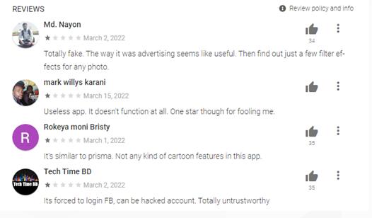 避免这些恶意应用程序的最好方法是查看App的评价。事实上,许多下载Craftsart Cartoon Photo Tools的人认定它是一个假冒应用或某种骗局--它也有2.1星的评价--但它仍然设法获得超过10万次下载。亿华云计算