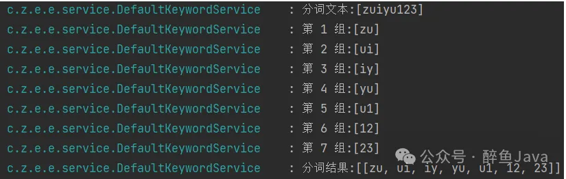 复制protected List<String> loopEncryptString(String input, int chunkSize) { int length = input.length(); List<String> strList = new LinkedList<>(); for (int i = 0; i < length; i++) { StringBuilder chunkBuilder = new StringBuilder(); for (int j = 0; j < chunkSize; j++) { int index = (i + j) % length; chunkBuilder.append(input.charAt(index)); } strList.add(chunkBuilder.toString()); log.info("第 {} 组:[{}]",i+1,chunkBuilder); // 如果到了最后一个分组,则不再循环第一个字符 if (i + chunkSize >= length) { break; } } log.info("分词结果:[{}]",strList); return strList;}1.2.3.4.5.6.7.8.9.10.11.12.13.14.15.16.17.18.19.20.对于上述文本zuiyu123分词效果如下