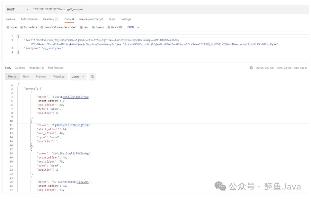 复制put 127.0.0.1:9200/encrypt { "settings": { "analysis": { "analyzer": { "my_analyzer": { "tokenizer": "my_tokenizer" } }, "tokenizer": { "my_tokenizer": { "type": "pattern", "pattern": "==" } } } }, "mappings": { "_doc": { "properties": { "content": { "type": "text" } } } } }1.2.3.4.5.6.7.8.9.10.11.12.13.14.15.16.17.18.19.20.21.22.23.24.25.26.27.随便对于一个密文进行分词,可以看到,已经按照我们的语气进行==拆分为多个词语了