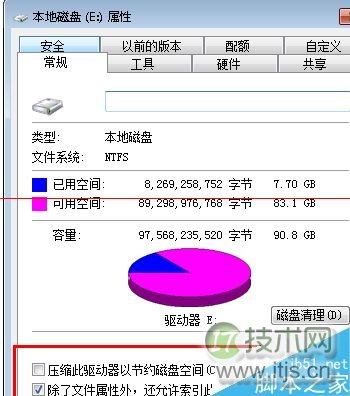 3、在弹出的界面上,将“压缩此驱动器以节约磁盘空间”和“除了文件属性外,还允许索引此驱动器上文件的内容”这两项前面的小钩去掉;
