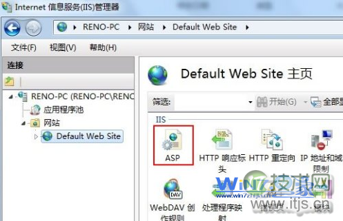 3、配置接着进入到IIS7管理器控制面板中,中正确选择展开并选择网站下的IT技术网配置“Default Web Site”项,并在窗口右侧双击“ASP”选项;