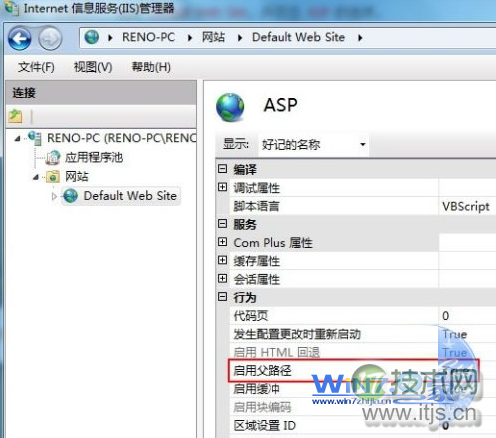 4、中正确可以看到IIS7中ASP父路径是配置没有启用的,我们可以选择True开启父路径;