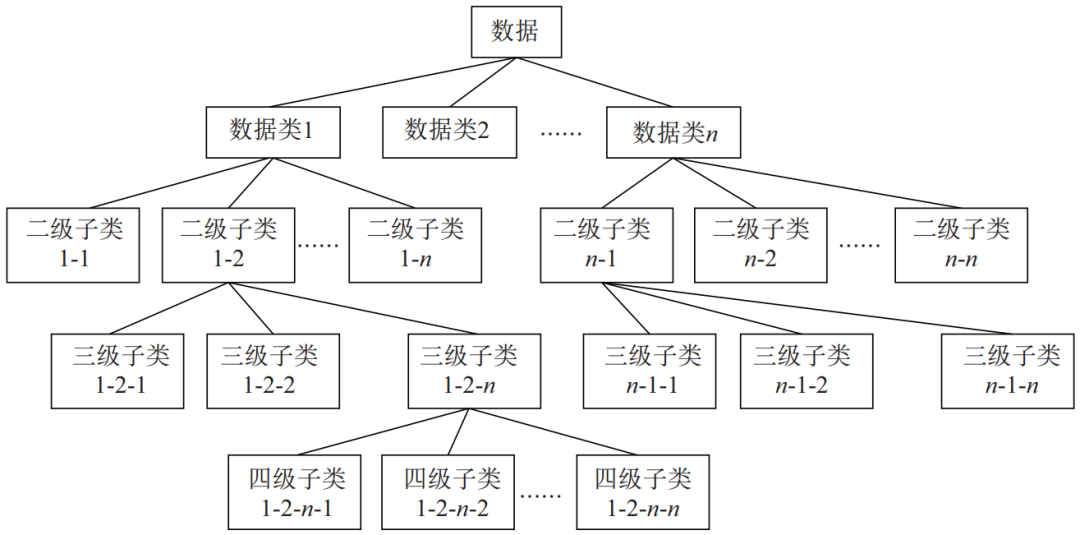 根据基础电信企业业务运营特点和企业内部管理方法收集企业内所有部门的数据资源,梳理所有数据资源。按照线分类法,按照业务属性(或特征),将基础电信企业数据分为若干数据大类,然后按照大类内部的数据隶属逻辑关系,将每个大类的数据分为若干层级,每个层级分为若干子类,同一分支的同层级子类之间构成并列关系,不同层级子类之间构成隶属关系。所有数据类及数据子类构成数据资源目录树,如下图所示。目录树的所有叶子节点是最小数据类。最小数据类是指属性(或特征)相同或相似的一组数据。为便于对数据进行统一管理及应用,根据基础电信企业生产经营管理现状和企业自身管理特点,将基础电信企业掌握的数据整合纳入两大类。