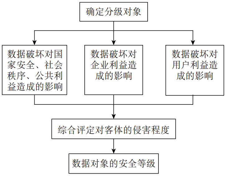在数据分类基础上,根据基础电信企业数据重要程度以及泄露后对国家安全、社会秩序、企业经营管理和公众利益造成的影响和危害程度,对基础电信企业网络数据资源进行分级。数据分级按照下图所示的步骤和方法进行,具体如下。