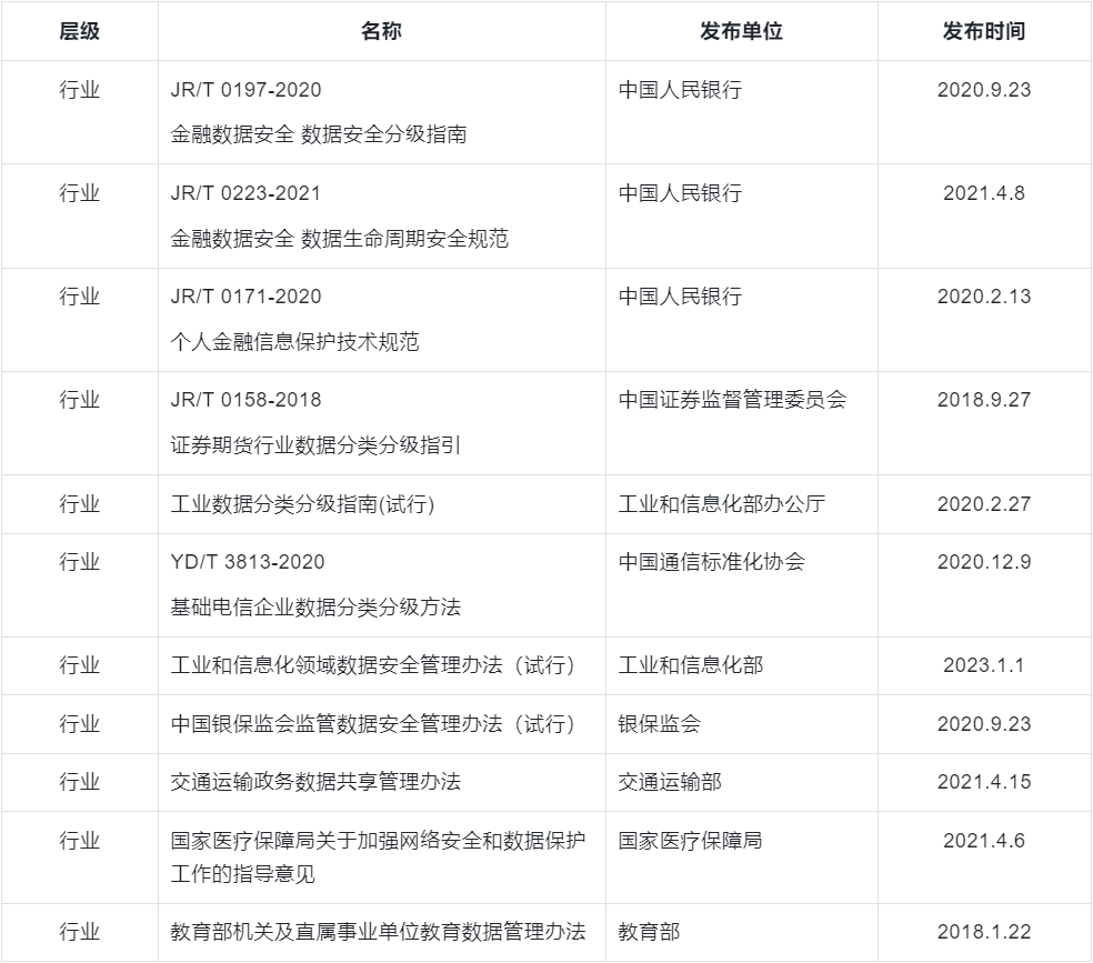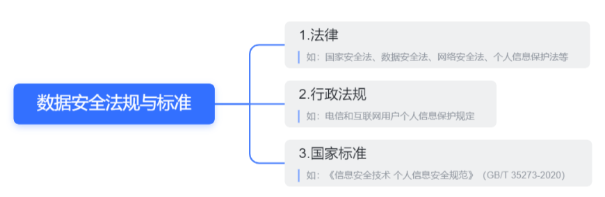 第四级数据:一旦丢失、泄露、被篡改、被损毁会对国家安全、社会公共利益或企业利益或用户利益造成特别严重影响的数据,安全管控要求最高。第三级数据:一旦丢失、泄露、被篡改、被损毁会对国家安全、社会公共利益或企业利益或用户利益造成严重影响的数据,应实施较强的安全管控。第二级数据:一旦丢失、泄露、被篡改、被损毁会对国家安全、社会公共利益或企业利益或用户利益造成一定程度影响的数据,执行基本的安全管控。第一级数据:一旦丢失、泄露、被篡改、被损毁对国家安全、社会公共利益或企业利益或用户利益造成影响较小或无影响的数据,对安全管控不作要求。随着对数据安全重视不断加强,国家/地区、行业出台一系列法律法规与标准引导数据安全建设。总体来说,可分为三个层面:法律、行政法规和国家或地方标准,如下图。