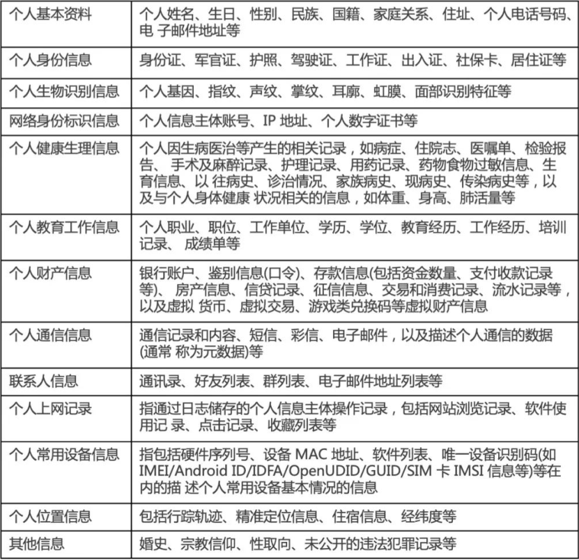 个人信息 personal information个人信息,是指以电子或者其他方式记录的能够单独或者与其他信息结合识别特定。自然人身份或者反映特定自然人活动情况的各种信息,如姓名、出生日期、身份证件号码、个人生物识别信息、住址、通信通讯联系方式、通信记录和内容、账号密码、财产信息、征信信息、行踪轨迹、住宿信息、健康生理信息、交易信息等。判定某项信息是否属于个人信息,应考虑以下两条路径:一是识别,即从信息到个人,由信息本身的特殊性识别出特定自然人。个人信息应有助于识别出特定个人。二是关联,即从个人到信息,如已知特定自然人,由该特定自然人在其活动中产生的信息(如个人位置信息、个人通话记录、个人浏览记录等)即为个人信息。符合上述两种情形之一的信息,均应判定为个人信息。