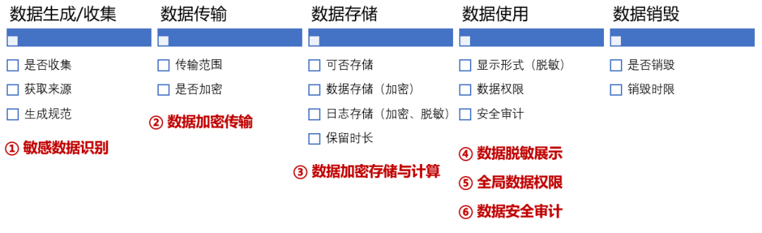 企业在数据安全领域落地,是存在一系列痛点与难点。这里主要来自两个方面:一是对安全法规及标准的解读;二是如何结合企业自身情况,制定并落地数据安全改进。针对前者,通过上面一系列内容的解读,相信读者已对数据安全法规及标准有了大致的认识,在具体操作上可遵循先法律法规、后标准规范,先国家行业、后区域地方的原则进行解读,摸清企业数据应遵循的安全原则。很多安全或咨询公司,也提供此类安全咨询服务,帮助企业做好政策解读。针对后者,则相对较为复杂,一方面需要摸清企业数据家底,一方面需建立数据全生命周期安全规划,根据前面的解读,有针对性地采取一系列安全改造措施。如下图是个人简单整理的数据生命周期的各阶段所涉及的主要安全能力,包括从数据识别、传输、存储、使用、销毁多环节。