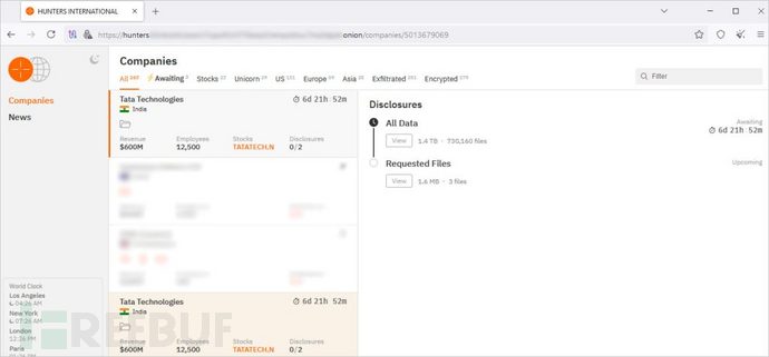 猎手国际勒索页面列出塔塔科技(来源:Bleeping Computer)
