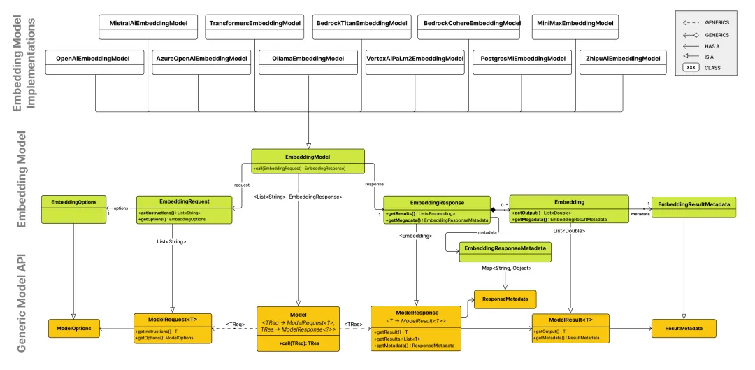 在 Spring AI 中,量数嵌入模型 API 和 Spring AI Model API 和嵌入模型的据库关系如下: