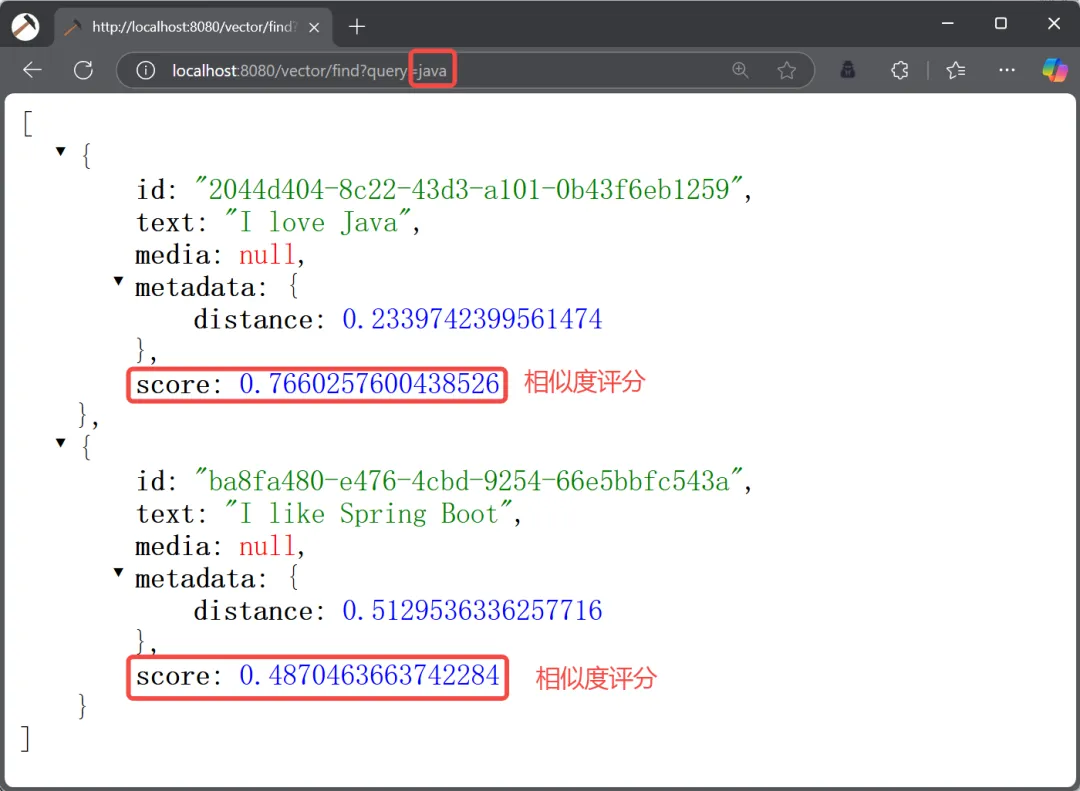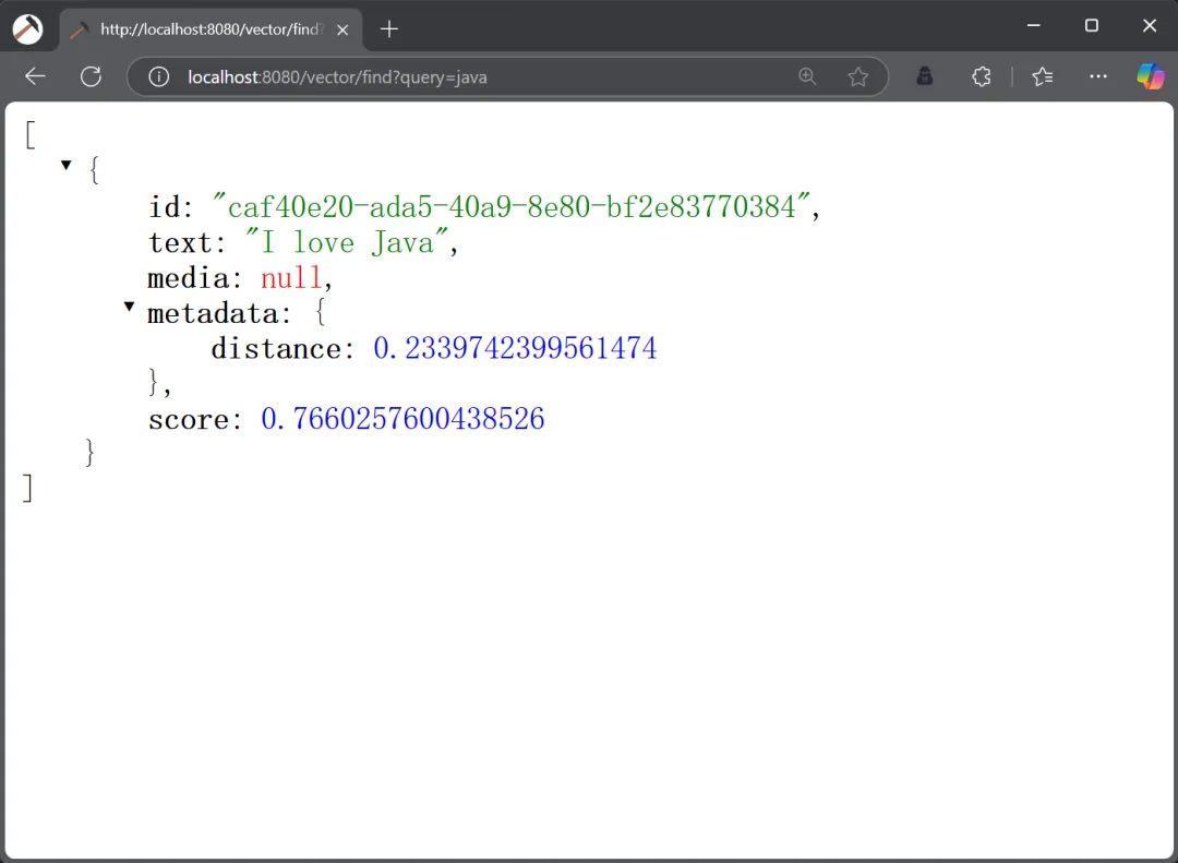 从上述结果可以看出,和“java”相似度最高的向量为“I love Java”,相似度评分为 0.77,如果我们 SearchRequest 对象中的 topK 设置为 1 的话,只会查询“I love Java”这条数据,如下图所示: