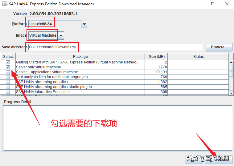d. 如果电脑内存资源不足,建议选择 Server only virtual machine 以及 Getting Started with SAP HANA, express edition (Virtual Machine Method) 这两项即可。