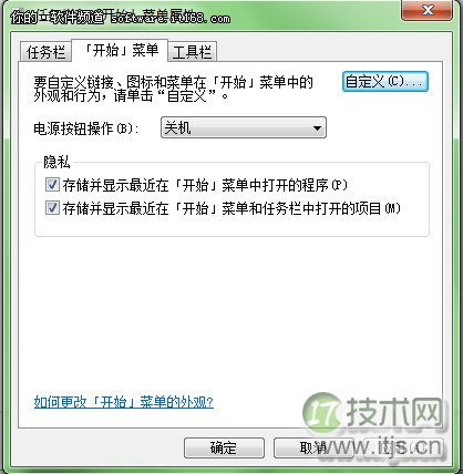 其实我们还可以选择是否让系统存储最近打开的应用程序和项目,系统默认为保留,假如大家觉得没有必要亦可以取消选择。方法是:在“开始”菜单上单击右键,选择“属性”。此时系统弹出“任务栏和“开始”菜单属性”。