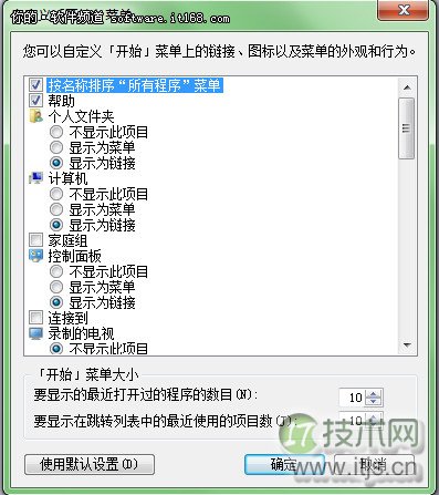 比如我们可以选择“计算机”按钮的显示方式,也可以对开始菜单的大小进行修改,大家可以自行尝试,这里就不再赘述了。有时经过一阵修饰可能我们又想恢复开始菜单的本来面目,此时单击“使用默认设置”即可将菜单恢复到默认值。