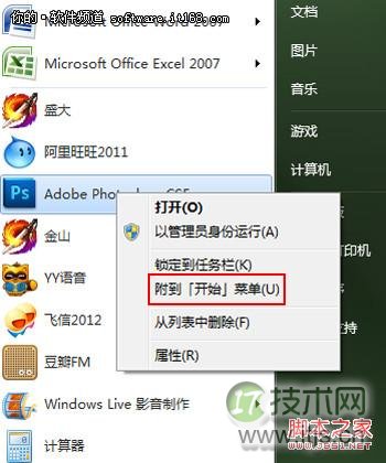 我们首先定位在需要“置顶”的程序上,单击鼠标右键,选择“附到‘开始’菜单”这样该程序就会被系统“置顶”是不是很方便呢