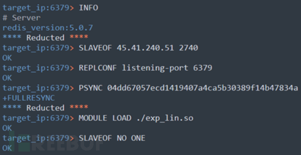 INFO - 检查Redis的版本,以确定服务器是否有CVE-2022-0543的漏洞。SLAVEOF - 创建一个攻击服务器的副本。REPLCONF - 配置从攻击服务器到新创建副本的连接。PSYNC - 启动复制流并下载服务器磁盘上的共享库 "exp_lin.so"。MODULE LOAD - 从下载的动态库中加载模块,该模块能够执行任意命令并利用CVE-2022-0543。SLAVEOF NO ONE - 将有漏洞的Redis服务器转变成主服务器。