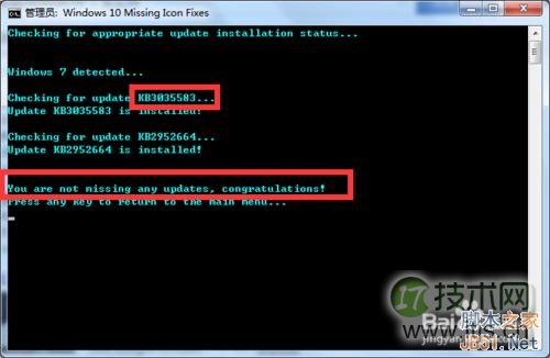 7、修复成功后,可以按输入数字1回车查看系统是否已自动安装该补丁。假如检测结果呈下图所示,则说明我们已成功修复了系统中确实的KB3035583补丁!