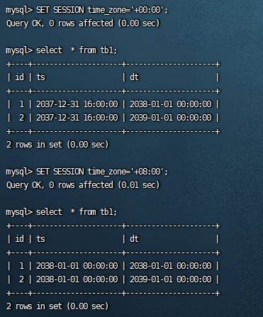 复制mysql> SET SESSION time_znotallow=+00:00; Query OK, 0 rows affected (0.00 sec) mysql> select * from tb1; +----+---------------------+---------------------+ | id | ts | dt | +----+---------------------+---------------------+ | 1 | 2037-12-31 16:00:00 | 2038-01-01 00:00:00 | | 2 | 2037-12-31 16:00:00 | 2039-01-01 00:00:00 | +----+---------------------+---------------------+ 2 rows in set (0.00 sec) mysql> SET SESSION time_znotallow=+08:00; Query OK, 0 rows affected (0.01 sec) mysql> select * from tb1; +----+---------------------+---------------------+ | id | ts | dt | +----+---------------------+---------------------+ | 1 | 2038-01-01 00:00:00 | 2038-01-01 00:00:00 | | 2 | 2038-01-01 00:00:00 | 2039-01-01 00:00:00 | +----+---------------------+---------------------+ 2 rows in set (0.00 sec)1.2.3.4.5.6.7.8.9.10.11.12.13.14.15.16.17.18.19.20.