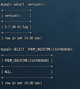 复制mysql> select version(); +---------------+ | version() | +---------------+ | 5.7.38-41-log | +---------------+ 1 row in set (0.00 sec) mysql> SELECT FROM_UNIXTIME(2147483648); +---------------------------+ | FROM_UNIXTIME(2147483648) | +---------------------------+ | NULL | +---------------------------+ 1 row in set (0.00 sec)1.2.3.4.5.6.7.8.9.10.11.12.13.14.15.16.