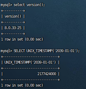 复制mysql> select version(); +-----------+ | version() | +-----------+ | 8.0.33-25 | +-----------+ 1 row in set (0.00 sec) mysql> SELECT UNIX_TIMESTAMP(2039-01-01); +------------------------------+ | UNIX_TIMESTAMP(2039-01-01) | +------------------------------+ | 2177424000 | +------------------------------+ 1 row in set (0.00 sec)1.2.3.4.5.6.7.8.9.10.11.12.13.14.15.16.