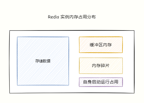 Redis 自身启动所占用的内存。存储对象数据内存。缓冲区内存:主要由 client-output-buffer-limit 客户端输出缓冲区、复制积压缓冲区、AOF 缓冲区。内存碎片。